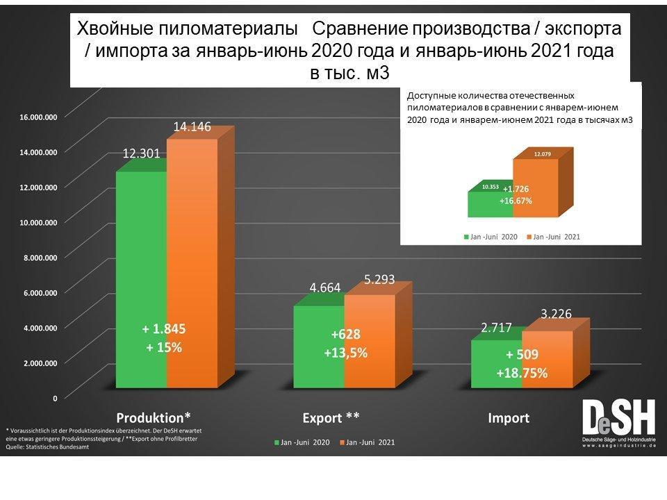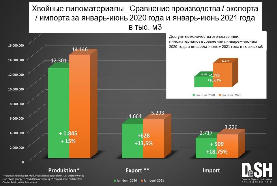 Включая импорт пиломатериалов хвойных пород в размере 3,2 миллиона м³, на немецком рынке в первой половине 2021 года было доступно рекордное количество пиломатериалов из хвойных пород, составившее более 12 миллионов м³, что на 1,7 миллиона м³ (16,7 процента) больше, чем в первом полугодии 2021 года. в прошлом году.