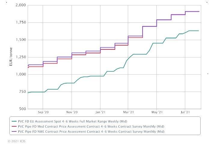 Ежемесячные контрактные цены ICIS на ПВХ в июле в Северо-Западной Европе (СЗЕ), Средиземноморье и Великобритании выросли из-за повсеместного дефицита.