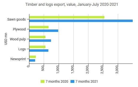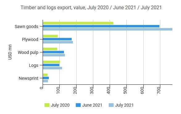 В июле экспорт пиломатериалов составил 1,6 млн тонн, что на 14,9% меньше по сравнению с аналогичным периодом прошлого года и на 27% меньше по сравнению с предыдущим месяцем и составило 772 млн долларов, что на 83% больше по сравнению с аналогичным периодом прошлого года и на 10,8% больше по сравнению с предыдущим месяцем.