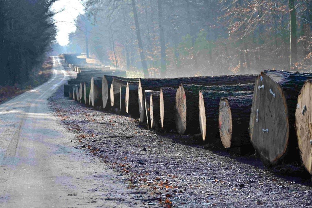 Фото: Стволы дуба, – ценные резервуары углерода, выложены ствол за стволом, чтобы их можно было рассмотреть со всех сторон и оценить возможность дальнейшей обработки (© Hendrik Scholz, Sachsenforst)