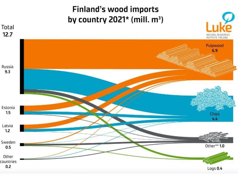 В 2021 году импорт древесины в Финляндию составил 12,7 млн кубометров или 0,5 млрд евро. Объем импорта древесины не изменился по сравнению с предыдущим годом. Из импорта древесины чуть более половины приходится на балансовую древесину и 35% на щепу. Дрова, консервированная древесина и древесные отходы вместе взятые составляли 8%, а бревна – 3%. Объем импорта балансовой древесины увеличился на 2% по сравнению с предыдущим годом, а объем импорта древесной щепы остался на прежнем уровне. Импорт бревен сократился на пятую часть.