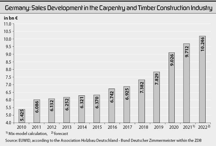 Ожидается, что в 2022 году оборот немецких столярных и деревянных строительных компаний увеличится на 5,5% по сравнению с предыдущим годом и составит 10,246 млрд евро. На 2021 год, согласно смешанной модели, используемой Федеральным статистическим управлением (Destatis), Висбаден, которая объединяет данные для компаний с 20 или более сотрудниками, зарегистрированные Destatis, с данными для компаний с менее чем 20 сотрудниками, созданными с использованием данных, предоставленных налоговой службой (оборот) и Федеральным агентством занятости (занятость), оборот был экстраполирован до 9,712 млрд евро. Согласно отчету о состоянии на 2022 год, опубликованному 20 мая Verband Holzbau Deutschland – Bund Deutscher Zimmermeister im Zentralverband des Deutschen Baugewerbes (ZDB), Берлин, примерно 25% прироста будет связано с дополнительными работами, а 75% – с повышением цен. В 2020 году зафиксирован рост на 15,3%; дополнительные работы по-прежнему вносили две трети в эту цифру, а повышение цен на деревянные строительные изделия – одну треть.