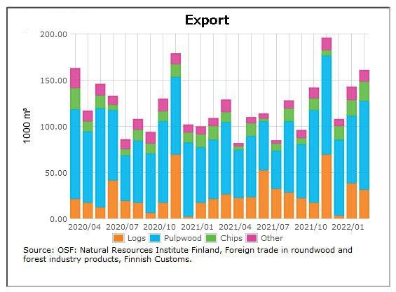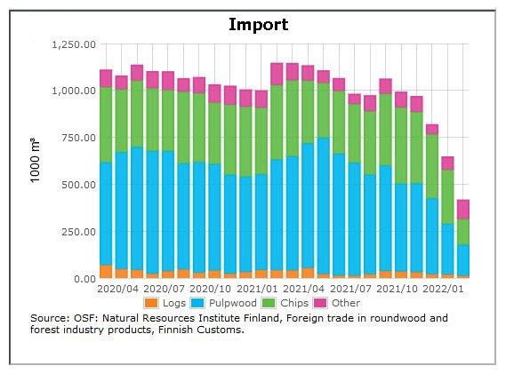 - В первом квартале года импорт древесины составил 1,87 млн кубометров и уменьшился на 40% по сравнению с аналогичным периодом предыдущего года. Из импортируемой древесины 45% составляли балансы, 41% щепа и 3% бревна. По сравнению с аналогичным периодом прошлого года импорт балансовой древесины сократился на 48%. Импорт щепы сократился на 32%, а бревен – на 56%. В марте импорт древесины составил 0,41 млн кубометров и стал самым низким месячным объемом импорта в 21 веке.