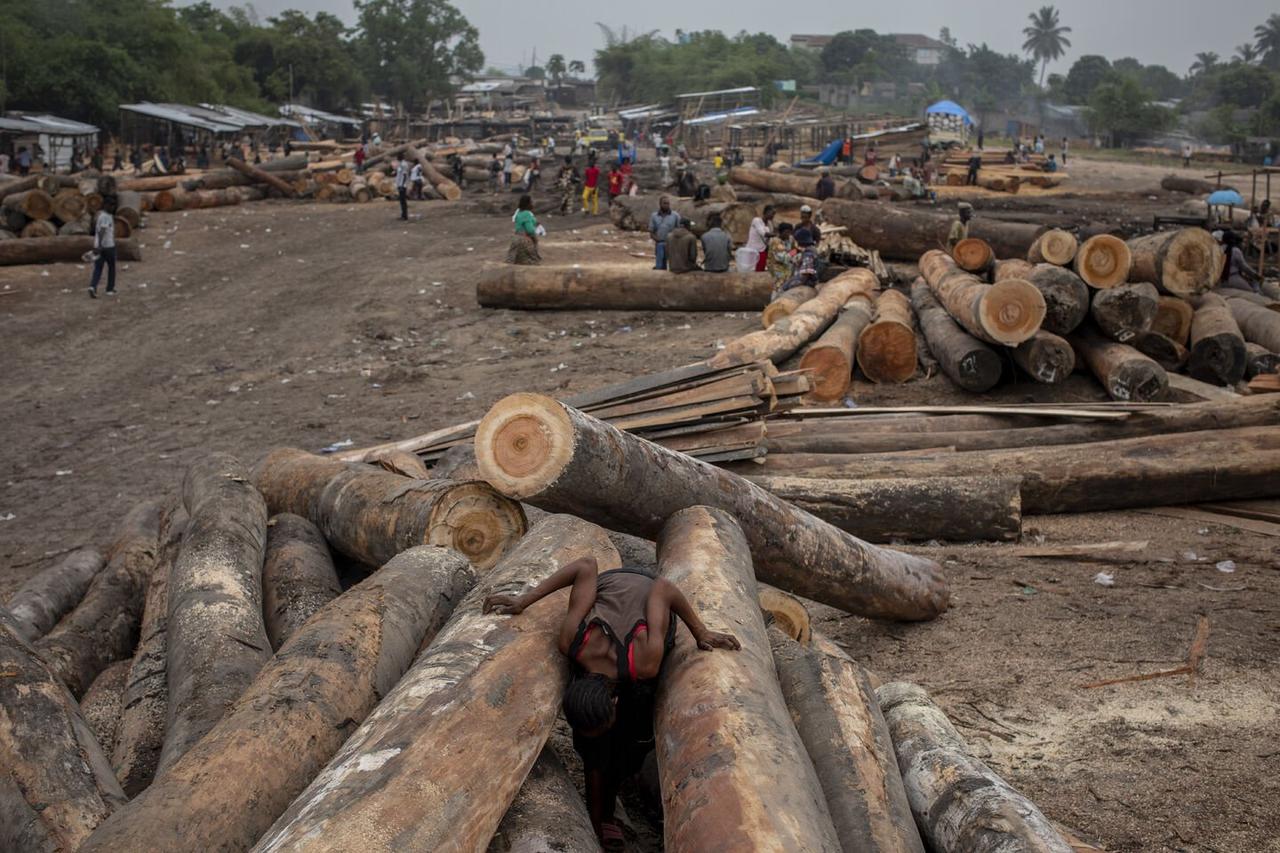 Вдоль берега какофония грохочущих вилочных погрузчиков тащит стволы деревьев по колено в высохшей грязи. Визжащие бензопилы рвут дерево, разбрасывая обрезки в воздухе. Босые мускулистые рабочие бревна вверх по берегу реки, где мужчины превращают их в фанеру и доски. Женщины собирают обрезки коры, чтобы продать их для приготовления пищи.