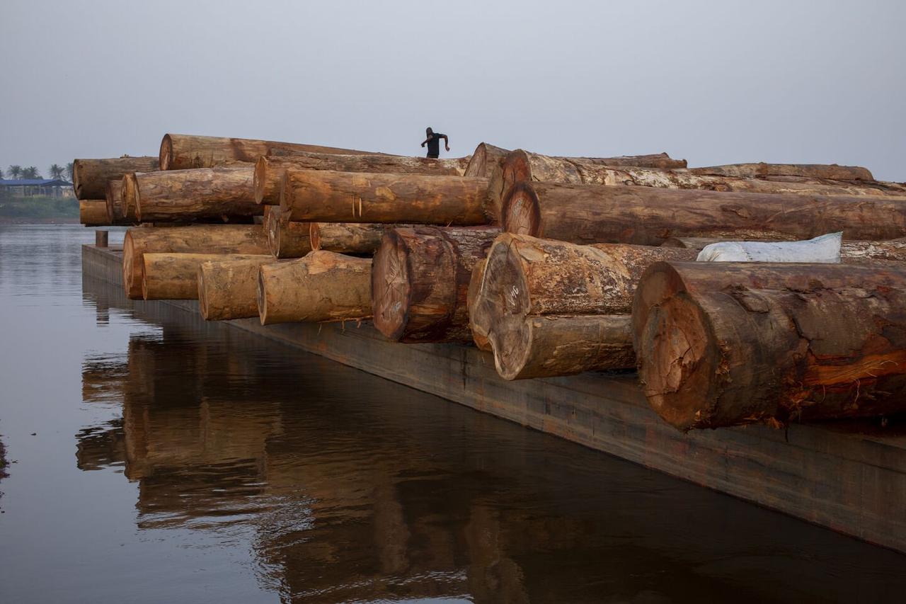 Нагромождение огромных бревен лежало на одной из барж на берегу реки, принадлежащей Sodefor, дочерней компании лихтенштейнской компании.