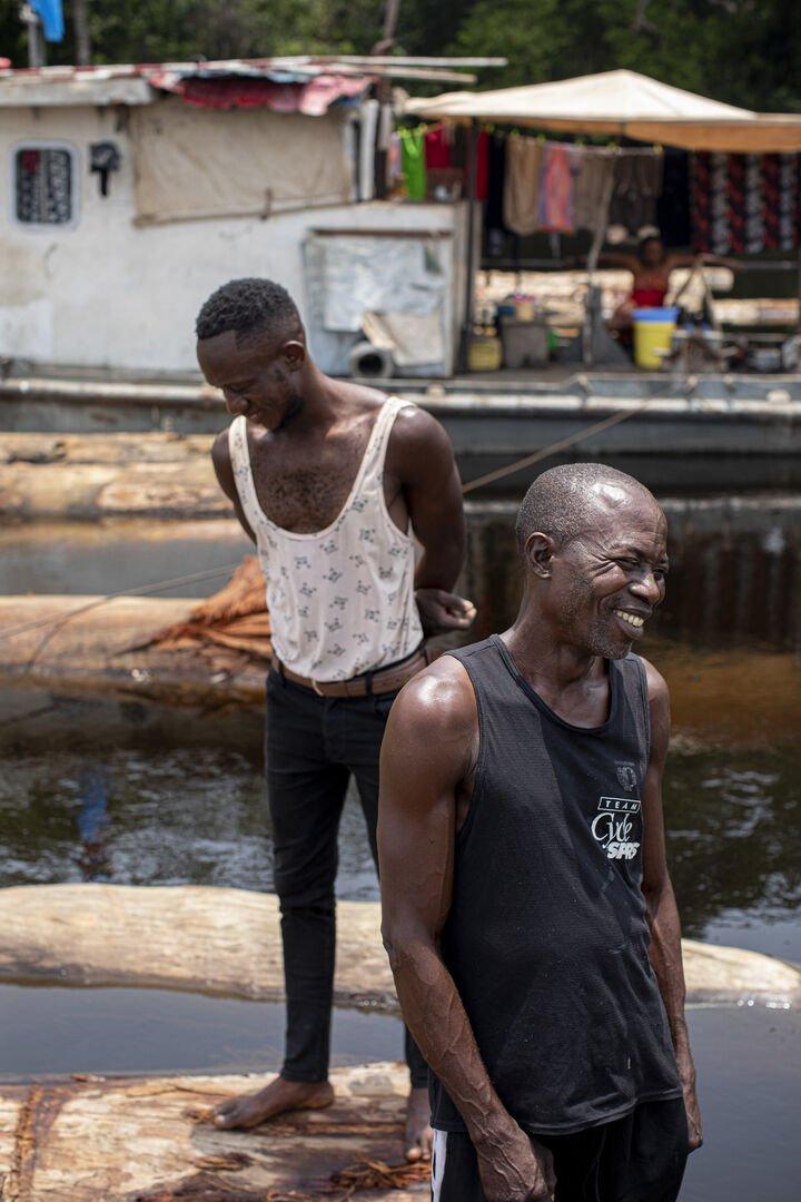 По соседству с лесозаготовительным портом Киншасы как можно быстрее обрабатывают гигантские новые баржи для перевозки круглого леса, по словам рабочих, по две-три в месяц, чтобы отправить их обратно вверх по реке, чтобы собрать, тем более эффективно, еще более ценные бревна.