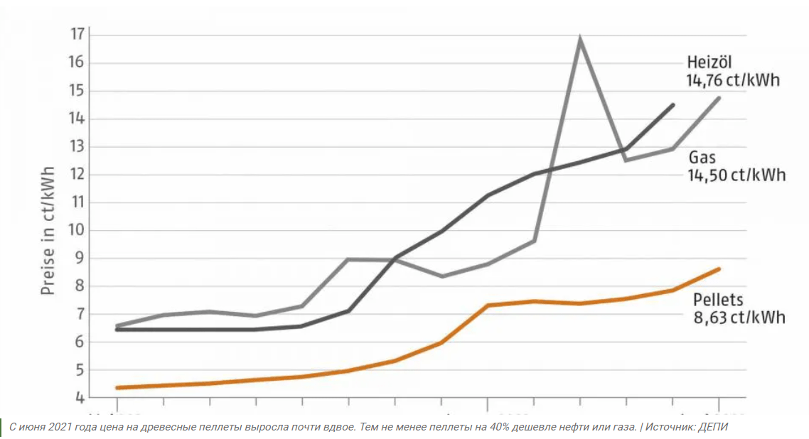 Высокий спрос в сочетании с высокими издержками производства означает, что цена на пеллеты продолжает расти. Однако по сравнению с мазутом и природным газом ценовое преимущество пеллет превышает 40%.