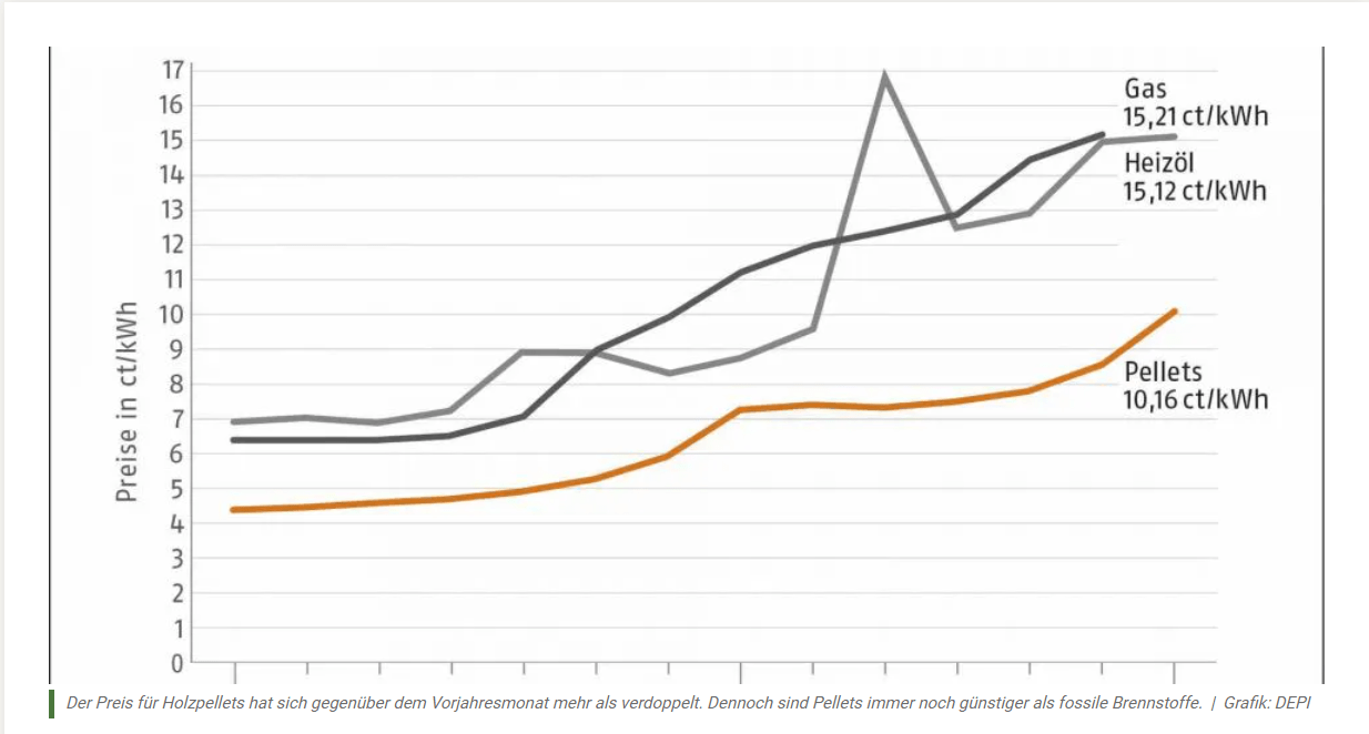 По словам управляющего директора DEPI Мартина Бентеле, в связи с текущими потрясениями на энергетических рынках даже одно рекордное производство за другим при таком высоком спросе больше не может оказывать сдерживающего влияния на цены. В последние два года пеллеты также были выше среднего, что делает скачок цен еще более болезненным.