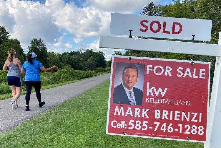Люди проходят мимо вывески «Продано» перед домом вдоль канала Эри в Питтсфорде, штат Нью-Йорк, в понедельник, 6 сентября 2021 года. Тед Шаффри / AP Photo