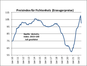 Лесовладельцы уже несколько недель сообщают, что спрос на пиломатериалы значительно падает. Многим лесовладельцам пришлось столкнуться со значительным снижением цен в ходе переговоров о цене с лесопильными предприятиями. В третьем квартале сообщалось о снижении цен на 20–25 евро/м3 на ведущий ассортимент ели 2b. Тем не менее, цены на древесину по-прежнему находятся на очень хорошем уровне.