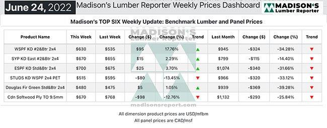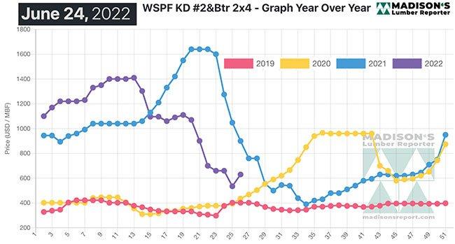 После сильного падения на предыдущей неделе, за неделю, закончившуюся 24 июня, цена эталонного пиломатериала из хвойных пород Western Spruce-Pine-Fir 2×4 #2&Btr KD (RL) составила 630 дол. США за 1000 досковых футов (267 USD/м3). Это на 95 долларов, или 18 процентов, больше, чем на предыдущей неделе, когда она составляла 535 долларов (227 USD/м3), но на 315 долларов, или 33 процента, меньше, чем месяц назад, когда она составляла 945 долларов (400 USD/м3).