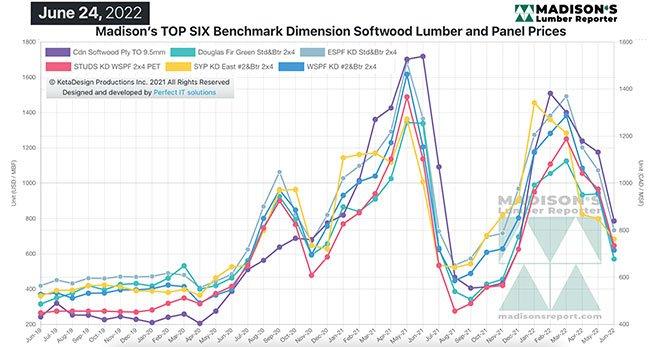 Что касается рынка пиломатериалов и текущих цен, то значительное снижение цен в середине июня способствовало возобновлению спроса на пиломатериалы хвойных пород. Действительно, настолько успешно, что цены почти вернулись к уровням предыдущей недели. Хотя объемы продаж все еще не были оптимальными, надвигающиеся сезонные сокращения побудили несколько неохотных клиентов нажать на курок и купить. Этого роста продаж было достаточно, чтобы побудить производителей поднять цены.