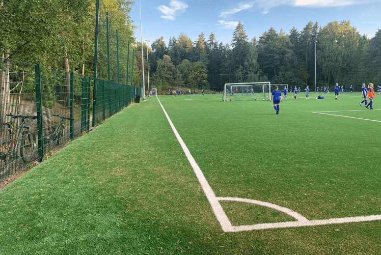 В Финляндии более 400 футбольных полей. Колючий зеленый искусственный газон изготовлен из синтетического материала, который более устойчив к износу и атмосферным воздействиям, чем натуральный газон.