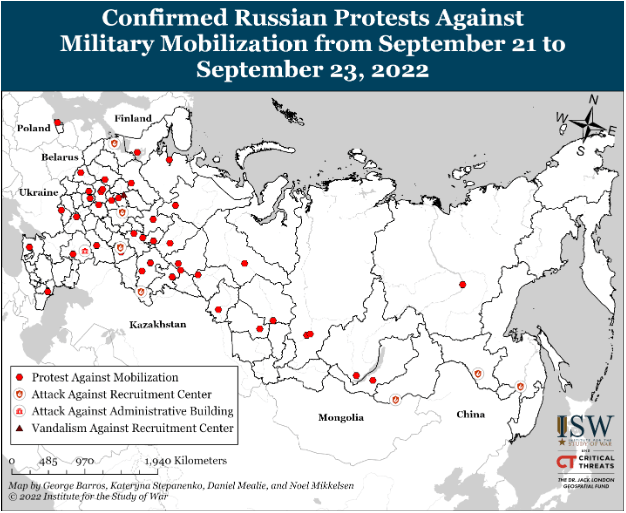 Несопоставимые процессы мобилизации в разных регионах могут усугубить социальную напряженность в России, уже возникшую из-за предполагаемого неравенства в создании добровольческих батальонов. Чеченский лидер Рамзан Кадыров заявил в прямом эфире, что Чеченская Республика не будет проводить мобилизацию, поскольку республика уже перевыполнила неустановленный план формирования сил на 254 процента. Кадыров добавил, что с 24 февраля Чечня уже направила на войну 20 000 военнослужащих. Однако Кадыров пригрозил мобилизовать всех протестующих в Чечне и отправить их на фронт. Затем Кадыров, по-видимому, изменил свои заявления, призывая противников мобилизации уважать суверенитет России вместо того, чтобы использовать конституцию для уклонения от службы. Первоначальное заявление Кадырова, адресованное чеченской общественности, может быть попыткой ответить и воспрепятствовать критике мобилизации, войны и самого себя в чеченском сообществе. Заявление Кадырова также может быть тревожным индикатором для Кремля: если один из самых громогласных и агрессивных сторонников войны чувствует необходимость отказаться от мобилизации своих людей, по крайней мере, публично, это может указывать на то, что даже Кадыров чувствует народное недовольство тем, что частичная мобилизация будет вызывать и, возможно, даже боится этого.