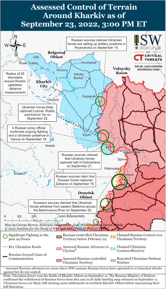 Украинские источники сообщили, что 23 сентября украинские силы продолжали отражать попытки России вернуть утраченные позиции в районе восточного Купянска. Украинские официальные лица также сообщили, что российские войска снова безуспешно атаковали плотину Печенегинского водохранилища, вероятно, в попытке затопить реку Северский Донец и помешать украинской логистике на ее восточном берегу.