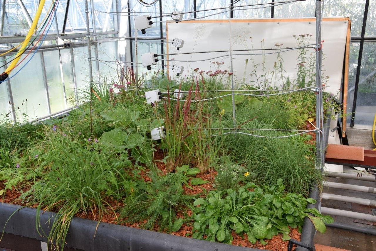 Модель зеленой крыши из разнообразных, в том числе многолетних трав с высокой испаряемостью. Июнь 2021 г. (Фото: HSWT) /слева/. Вид на шесть моделей зеленых крыш летом 2021 года (Фото: HSWT) /справа/
