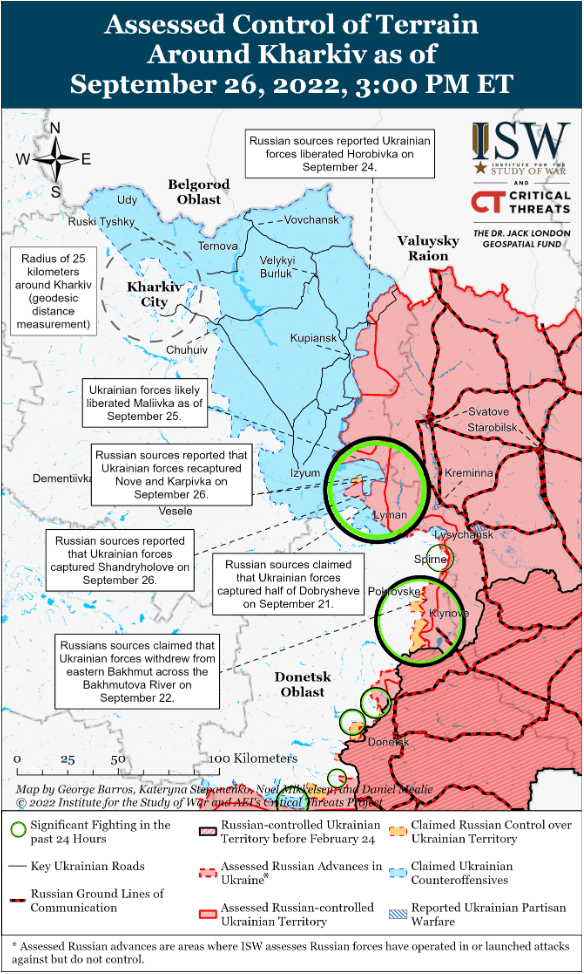25 и 26 сентября продолжалось контрнаступление украинских войск в Харьковской и северной части Донецкой областей в районе Лимана. Вероятно, 25 сентября украинские войска захватили Малиевку Харьковской области (25 км к северо-западу от Лимана). Несколько российских блогеров сообщили, что 26 сентября украинские силы захватили Шандриголово (12 км к северо-западу от Лимана), Карпивку (20 км к северо-западу от Лимана) и Нове (19 км к северу от Лимана) в Донецкой области. В некоторых российских сообщениях утверждалось, что российские войска отразили украинские атаки на Шандриголово, хотя в настоящее время ISW не может подтвердить эти сообщения. Российские источники заявили, что украинские силы расширили украинский плацдарм к северу от Дробышево и стремятся окружить российские силы в Лимане с северо-запада через Новое, Ставки и Колодязи. Российский милблогер сообщил, что украинские силы обстреливают сам Лиман из артиллерии.
