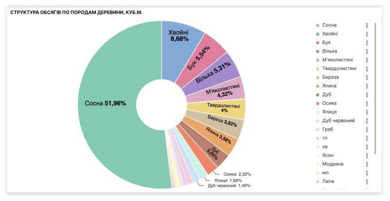 Попит мала сосна, інші хвойні породи та бук, де частка їх реалізації у загальній структурі склала 51,96%, 8,68% і 5,54% відповідно.