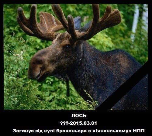 Дорослого самця лося, що мав надію найти безпечний притулок на заповідній території, було застрелено та випотрошено в ніч на 1 березня 2015 на території нацпарку між населеними пунктами Хаєнки та Воронівка. Це вже третє вбивство лося на території нацпарку. Перший випадок, коли від рук вбивці загинуло одразу двоє сохатих, був зафіксований безпосередньо в заповідній зоні 31 січня цього року. Всі три випадки схожі, а огляд залишків вказує на роботу одного того ж «майстра».