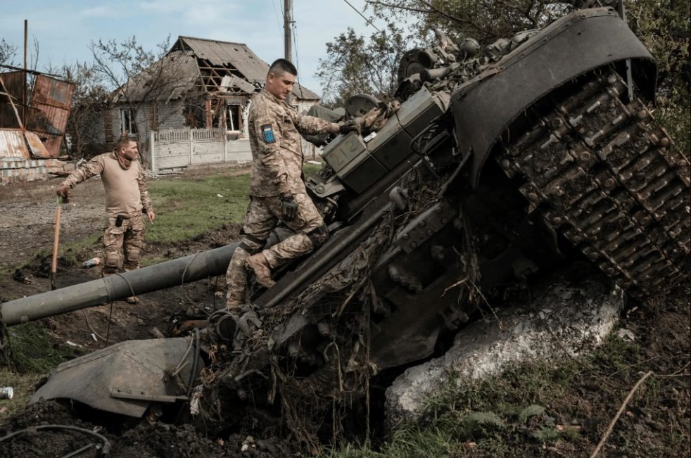 Украинские солдаты очищают брошенный российский танк Т-90А в пятницу в Кирилловке, в недавно отвоеванном районе под Харьковом.