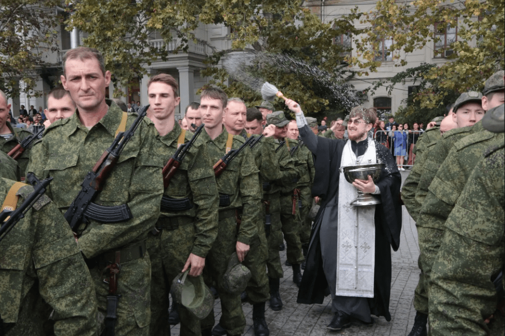 Резервисты призваны во время частичной мобилизации на церемонии отъезда во вторник в Севастополе, Крым. Фото … Agence France-Presse — Getty Images