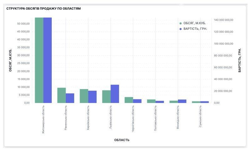Реалізація деревини відбулась у Житомирській, Рівненській, Харківській Львівській, Чернігівській та інших областях.