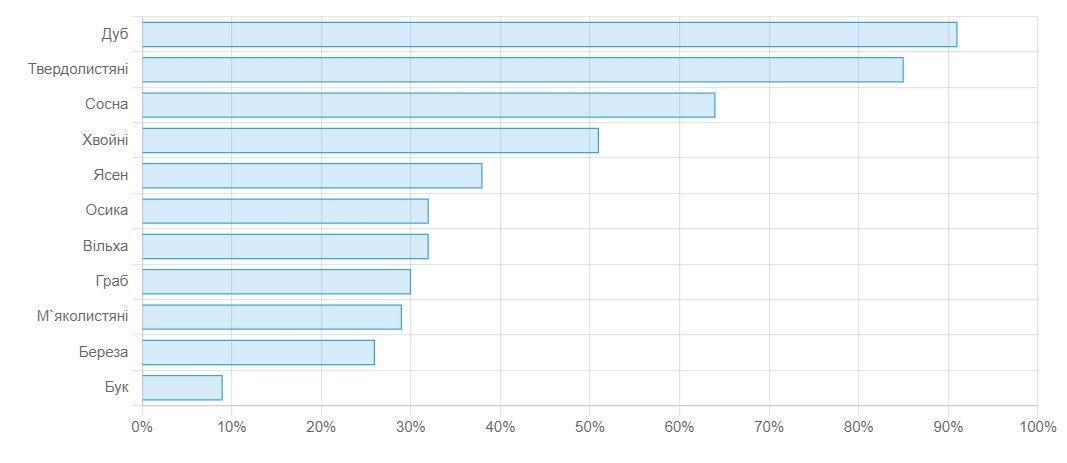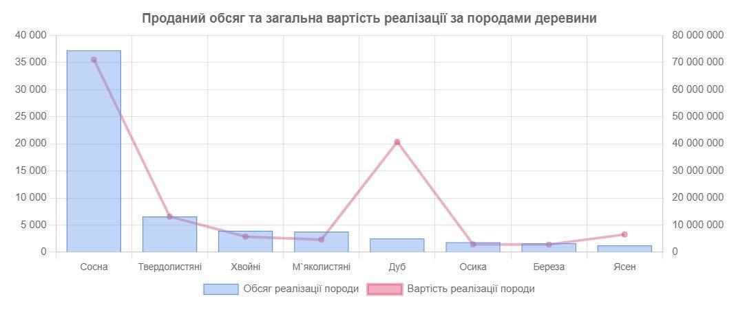 За словами заступника генерального директора ТОВ «УЕБ» Костянтина Шевчука найбільший попит мала сосна, породи твердолистяних і хвойних, де частка їх реалізації у загальній структурі склала 62%, 11% і 6% відповідно. Також була реалізація таких порід як дуб, осика, береза та інші.