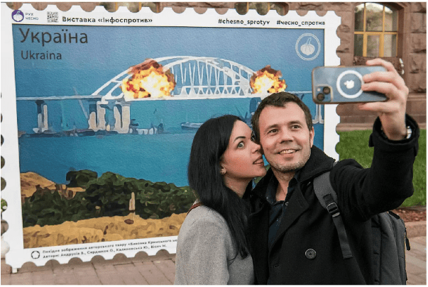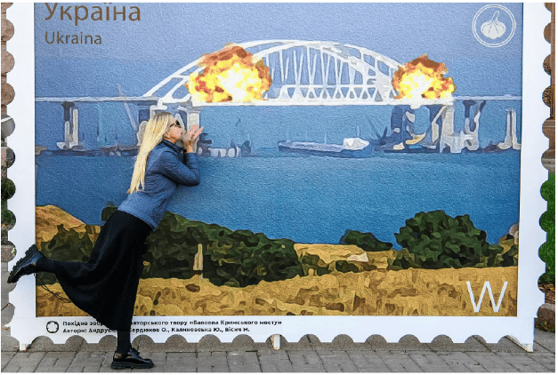 Украинцы фотографируются на фоне представления коллектива художников о взрывах на мосту через Керченский пролив в Киеве 8 октября. (Видео: EPA-EFE/Shutterstock)