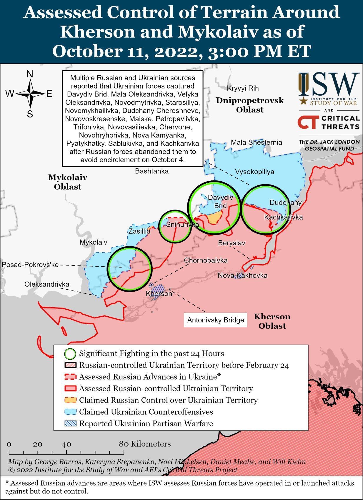 Российские источники продолжали утверждать, что 11 октября украинские войска проводили наземные атаки на севере и западе Херсонской области. Минобороны России утверждало, что две украинские батальонно-тактические группы (БТГ) вели наступательные операции в направлении Борозенское и Пятихатки — обе вдоль существующей линии фронта Давыдов Брод – Дудчаны на севере Херсонской области и примерно в 35 км от критического города Берислав, контролируемого Россией. Российский милблогер также указал, что украинские войска готовятся к продвижению южнее рубежа Давыдов-Брод-Дудчаны и ведут артиллерийскую подготовку для последующего удара по российским позициям в направлении Берислава. Российские милблогеры дополнительно указали, что украинские войска пытаются укрепить позиции в районе Давыдов Брод (западная часть Херсонской области вблизи границы с Николаевской областью и вдоль реки Ингулец), чтобы подготовиться к наступлению на юго-восток. Несколько российских источников сообщили, что украинские войска пытались атаковать в направлении Брускинского (6 км к югу от Давидова Брода), Ищенки (8 км к юго-востоку от Давидова Брода) и Садока (12 км к юго-востоку от Давидова Брода). ISW не предлагает оценки этих заявлений России относительно вероятных будущих украинских операций или группировок сил.