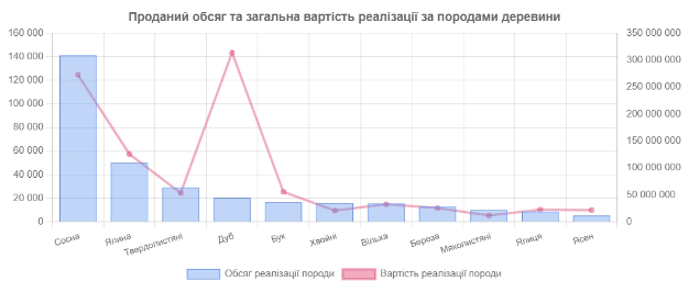 Як повідомив заступник генерального директора ТОВ «УЕБ» Костянтин Шевчук, найбільший попит серед покупців мали такі породи деревини, як сосна, ялина та твердолистяні. Частка їх реалізації у загальній структурі склала 42%, 15% і 9% відповідно. Також була реалізація таких порід як дуб, бук, вільха та інші.