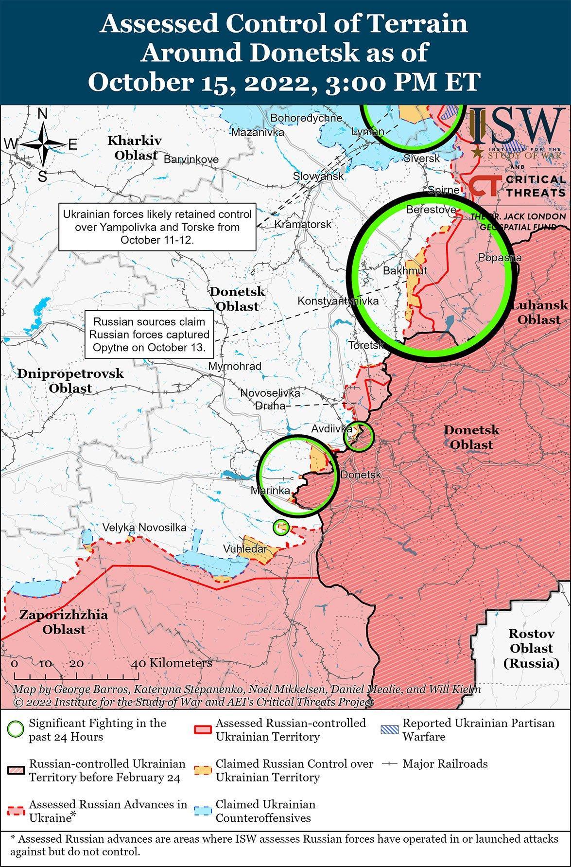 Российские войска продолжали наземные атаки в Донецкой области 15 октября. Генштаб Украины сообщил, что украинские силы отразили атаки российских наземных войск в районе Бахмута, к северо-востоку от Бахмута в районе Спирно, Берестово, Яковловка и Бахмутское, а также к югу от Бахмута в районе Оптино и Иванград. Российский источник утверждал, что российские войска уничтожили коротковолновый ретранслятор, нарушив работу украинской системы Starlink в районе Бахмут-Соледар. Российские источники утверждали, что боевые действия продолжаются в районе Соледар к северо-востоку от Бахмута и что российские силы усиливают неуточненные операции в этом районе. Украинский Генштаб также сообщил, что украинские силы отразили наземные атаки российских войск к юго-западу от Авдеевки в районе Первомайского, Невельского и Красногоровки, а также в районе Марьинки, Новомихайловки и Победы к юго-западу от Донецка. Российский источник заявил, что украинские силы теряют позиции в районе Авдеевки и отходят к Невельскому.