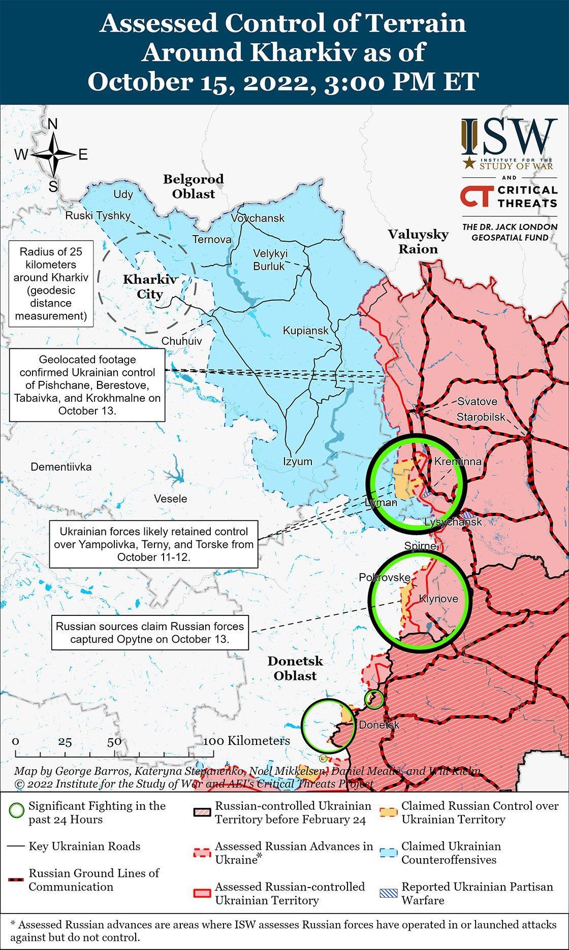15 октября российские войска продолжали контратаки западнее Кременной. Украинский Генштаб сообщил, что украинские войска отразили наземные атаки российских войск западнее Кременной в районе н. п. Новосадово (17 км к северо-западу от Кременной) и Терный (17 км к западу от Кременной). Российский милблогер повторил утверждения о том, что российские войска отбили Торское (14 км к западу от Кременной) и что украинские силы маневрировали вокруг российских позиций возле Торского, чтобы продвинуться к границе Сватовского района. ISW не может самостоятельно проверить ни одно из утверждений российского милблогера. 15 октября российские и украинские силы продолжали вести артиллерийский огонь вдоль линии Оскол-Кременная. Российские источники утверждали, что российские силы наносили удары по скоплениям украинской живой силы и техники в районе Берестова, Глушково, Купянска, Дворчина и Ольховки в Харьковской области и в районе Торского в Донецкой области и Макеевки Луганской области. Российские источники и источники в социальных сетях сообщили, что украинские силы нанесли удары по российским позициям в Северодонецке и на линии Сватово-Кременная, а также нанесли совместный удар по российской военной технике на купянском направлении.
