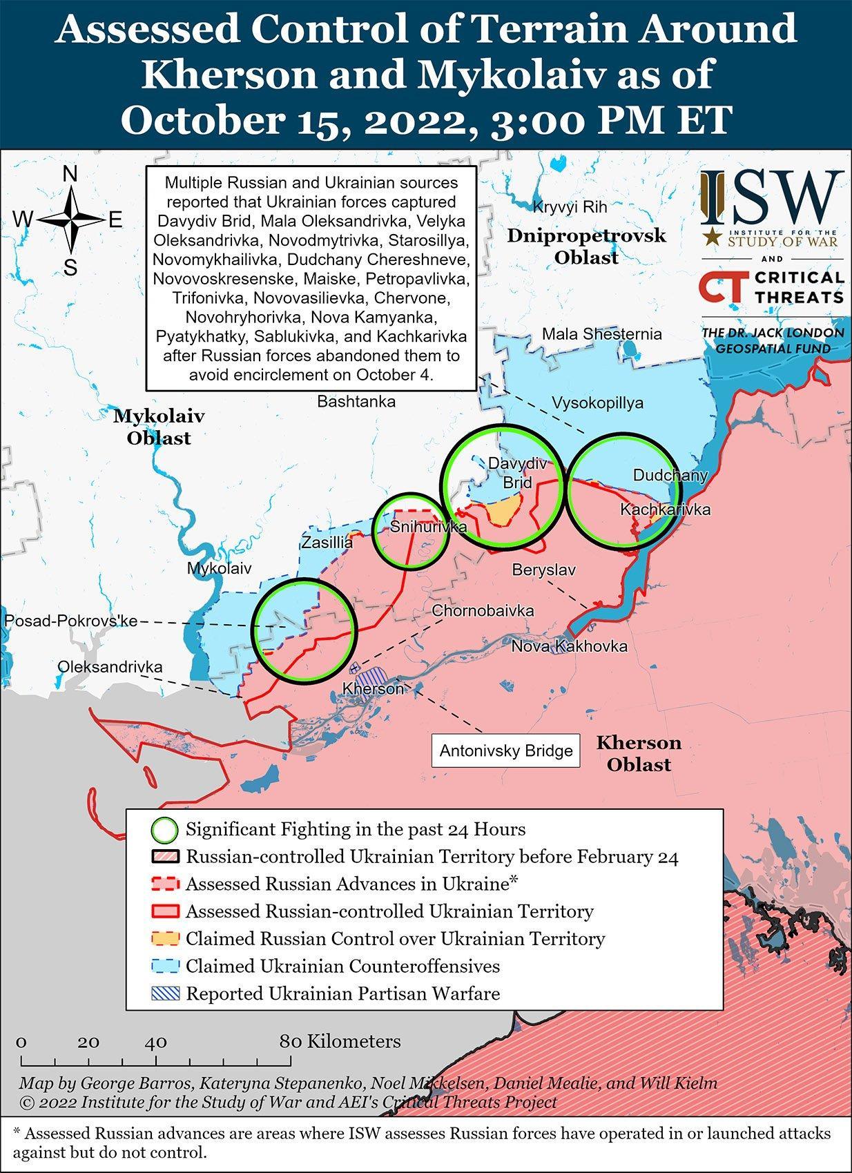 Российские источники утверждали, что 15 октября украинские войска перешли в общее контрнаступление на севере Херсонской области. Многочисленные российские блогеры сообщали, что украинские силы начали механизированное наступление на российские позиции вдоль всей линии фронта, которая проходит между Давидов Брод на северо-западе Херсонской области и Дудчанами на северо-востоке Херсонской области после проведения сосредоточенной артиллерийской подготовки на поля боя. Несколько российских источников утверждали, что украинские войска пытались прорвать российские позиции на северо-востоке Херсонской области в направлении Берислава и с северо-запада Херсонской области в направлении Ищенка и Садок. Эти российские претензии остаются необоснованными. Российские милблогеры настойчиво заявляли, что российские войска отразили все украинские атаки. Российские милблогеры уточнили, что это части 126-й бригады береговой обороны и 810-й отдельной гвардейской бригады морской пехоты Черноморского флота, 205-й отдельной мотострелковой бригады 49-й общевойсковой армии, 140-й зенитно-ракетной бригады 29-й общевойсковой армии и 10-я бригада специального назначения спецназа ведет ожесточенные бои и держит оборону в этом районе. Заявление о роли, которую играет 126-я бригада береговой обороны, заслуживает внимания в свете сообщений об истощении бригады.