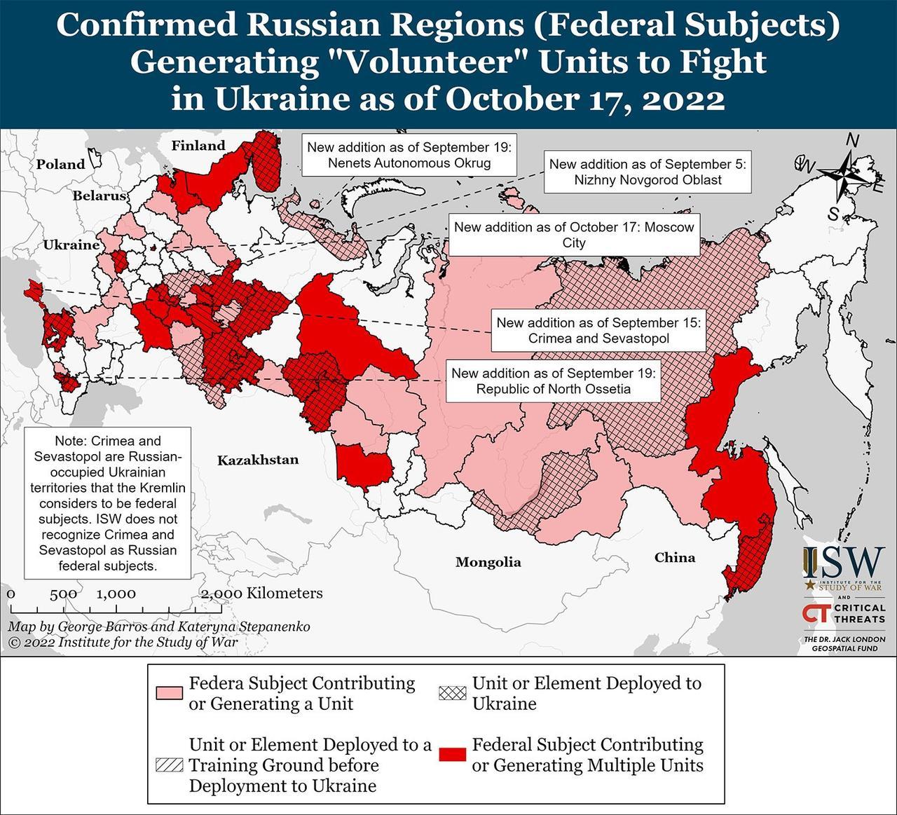 - Братоубийственная ссора между мобилизованными военнослужащими на полигоне в Белгородской области 15 октября, вероятно, является следствием того, что Кремль постоянно возлагает на этнические меньшинства бремя мобилизации в Российской Федерации.