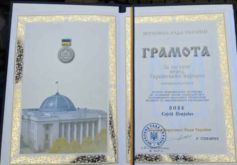 Лісоруба Зіньківського лісництва ДП “Гадяцький лісгосп” Сергія Вовка, який наразі захищає Україну від російської навали, нагородили Грамотою Верховної Ради України.