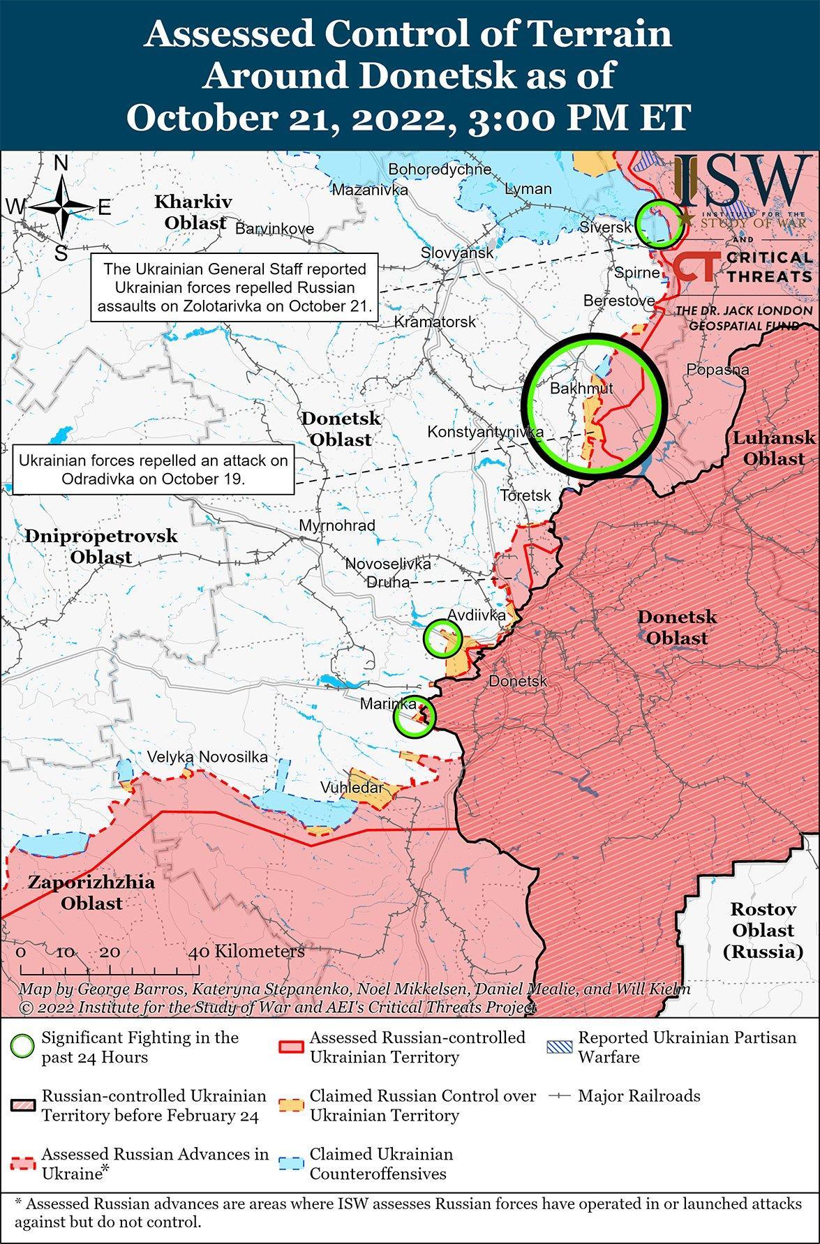 21 октября российские войска продолжали наземные атаки в Донецкой области. Украинский Генштаб сообщил, что украинские силы отразили атаки российских наземных войск в районе Бахмута, к северо-востоку от Бахмута в районе Соледара и к югу от Бахмута в районе Озаряновки, Оптино и Одрадовки. Российский источник утверждал, что боевики группы Вагнера продвинулись с позиций на восточной окраине Бахмута к центру Бахмута и что военнослужащие группы Вагнера взяли под контроль железную дорогу, по которой украинские силы снабжают район Бахмута. Российский источник утверждал, что российские силы, вероятно, имея в виду группу Вагнера или прокси-силы Донецкой Народной Республики (ДНР), захватили последнюю укрепленную украинскую позицию, прежде чем выйти к Оптино к югу от Бахмута. Украинский Генштаб также сообщил, что украинские силы отразили атаки российских сухопутных войск к востоку от Авдеевки в районе Первомайского и к юго-западу от Донецка в районе Марьинки и Победы. Российский источник утверждал, что российские войска нанесли наземные удары в районе Марьинки и к юго-западу от Авдеевки в направлении Невельского. Министерство обороны России заявило, что российские войска отразили попытки украинских небольших групп атаковать российские позиции в районе Времовского выступа на западе Донецкой области.