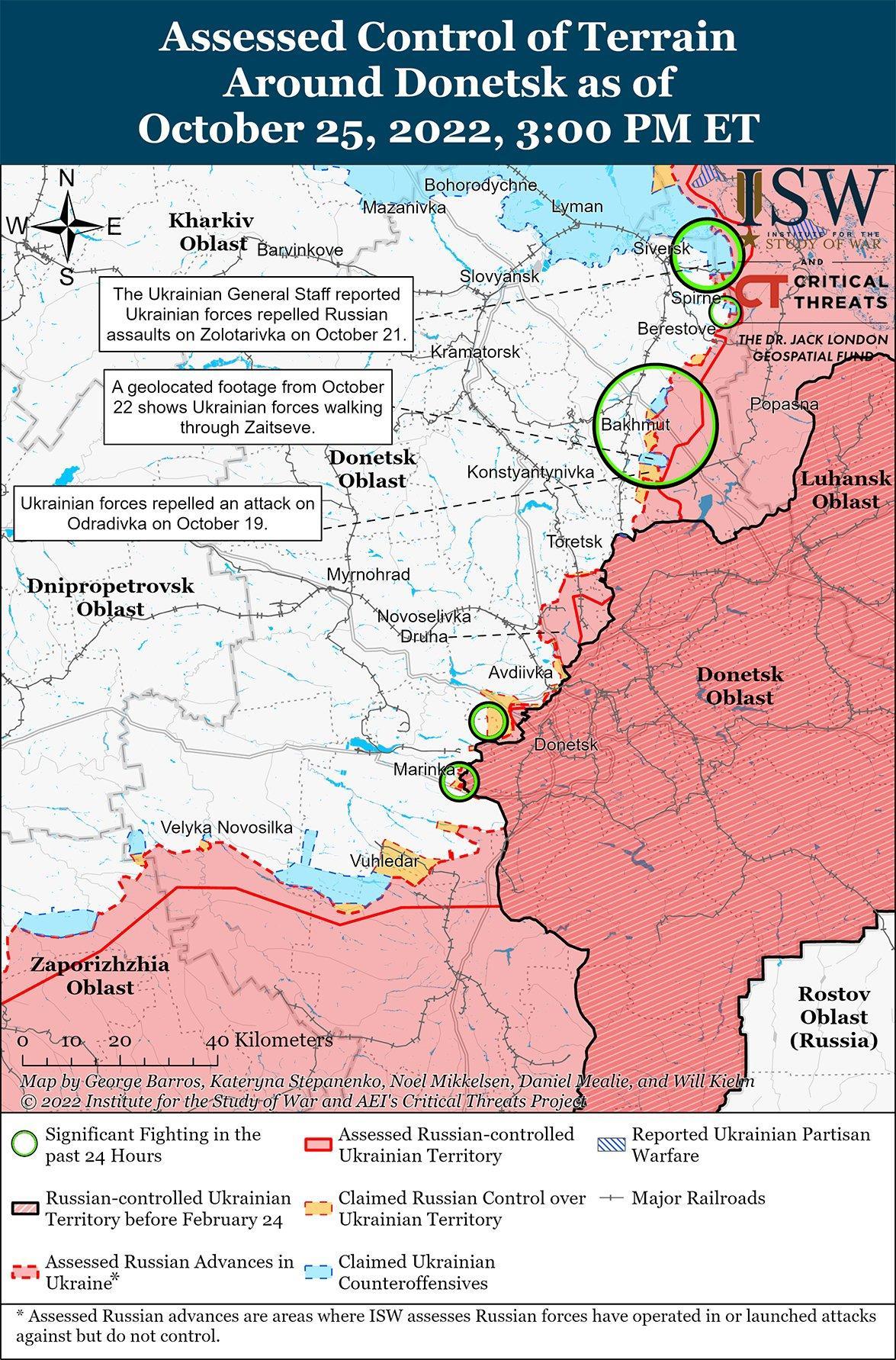 25 октября российские войска продолжали безуспешно наносить наземные удары в Донецкой области. Генштаб Украины сообщил, что украинские войска отразили российские атаки на сам Бахмут; к северо-востоку от Бахмута вблизи г. Бахмутское (11 км к северо-востоку от Бахмута), Соледар (13 км к северо-востоку от Бахмута), Белогоровка (23 км к северо-востоку от Бахмута), Верхнокаменское (33 км к северо-востоку от Бахмута) и Спирно (30 км к северу от Бахмута); и к югу от Бахмута возле Иванграда (4 км к юго-востоку от Бахмута) и Клищевки (7 км к юго-западу от Бахмута). Украинский Генштаб также сообщил, что украинские силы отразили атаки российских войск к юго-западу от Авдеевки в районе Марьинки (28 км к юго-западу от Авдеевки) и Невельского (15 км к югу от Авдеевки). Народное ополчение Донецкой Народной Республики (ДНР) 25 октября заявило, что «битва за Авдеевку идет полным ходом» и российские войска намерены окружить Авдеевку. Маловероятно, что российские войска смогут окружить Авдеевку, учитывая плохую эффективность российских наступательных операций под Авдеевкой с начала войны. Российский милблогер заявил, что оперативное окружение Россией Авдеевки и Угледара в Донецкой области невозможно, поскольку недавние российские наступления в этих районах показывают, что российские силы не могут быстро продвигаться вперед. Генштаб Украины сообщил, что 25 октября российские силы продолжали вести огонь с закрытых позиций вдоль линии соприкосновения в Донецкой области.