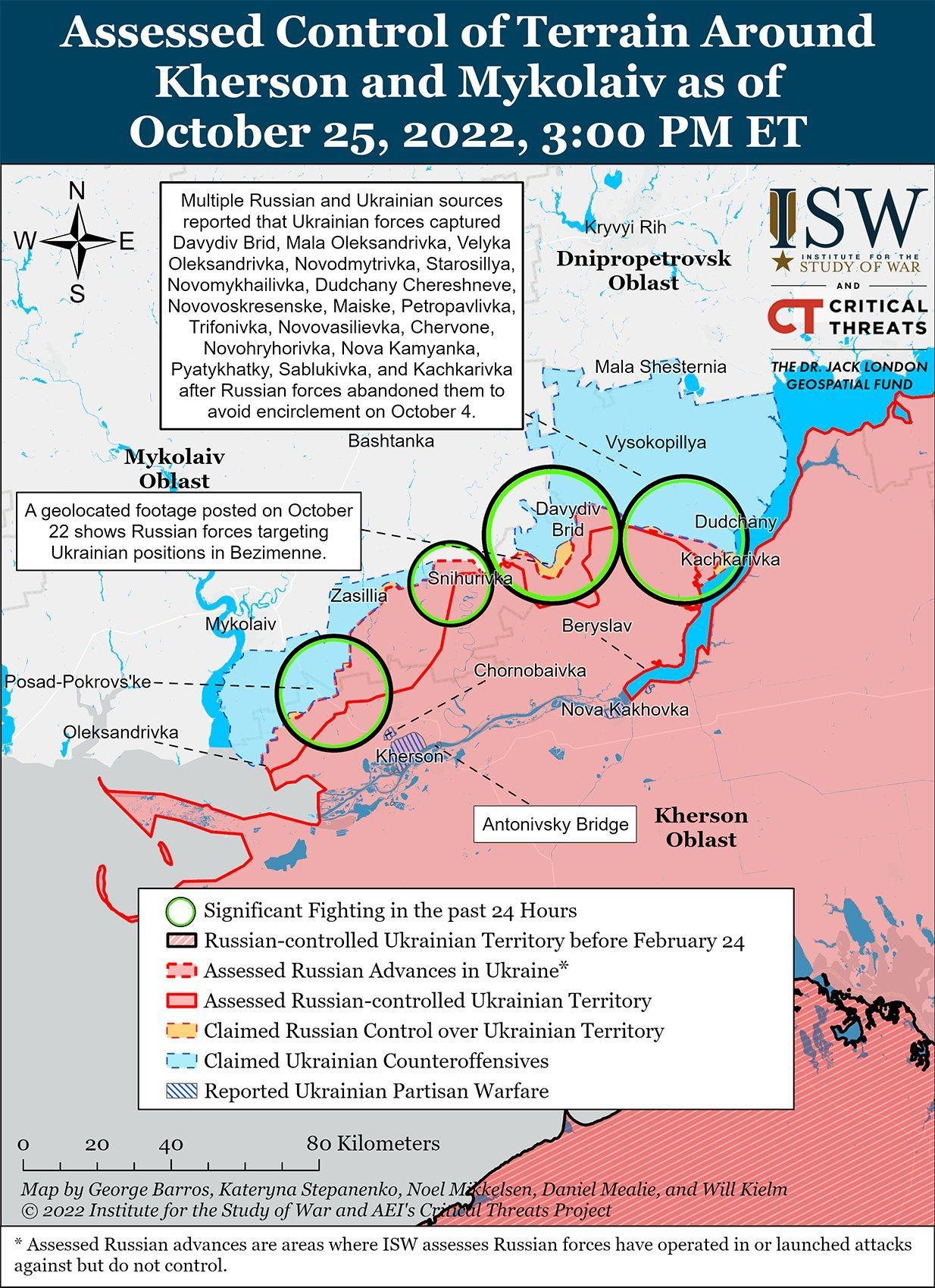 25 октября российские силы продолжали занимать запасные позиции у Днепра. Украинский Генштаб сообщил, что российские силы готовят оборонительные позиции на восточном берегу Днепра и минируют береговую линию в районе Горностаевки, примерно в 40 км к северо-востоку от Новой Каховки. В Генштабе Украины добавили, что российские войска оставляют небольшие проходы для потенциального отступления и пытаются восстановить разрушенные понтонные переправы. Российские милблогеры утверждали, что российское военное командование не определилось с судьбой Херсона, учитывая текущую ситуацию в Херсонской области. Другие блогеры утверждали, что российские войска не смогут удержать Херсон и что российское правительство может предотвратить «Сталинградскую битву», полностью отойдя на восточный берег Днепра.