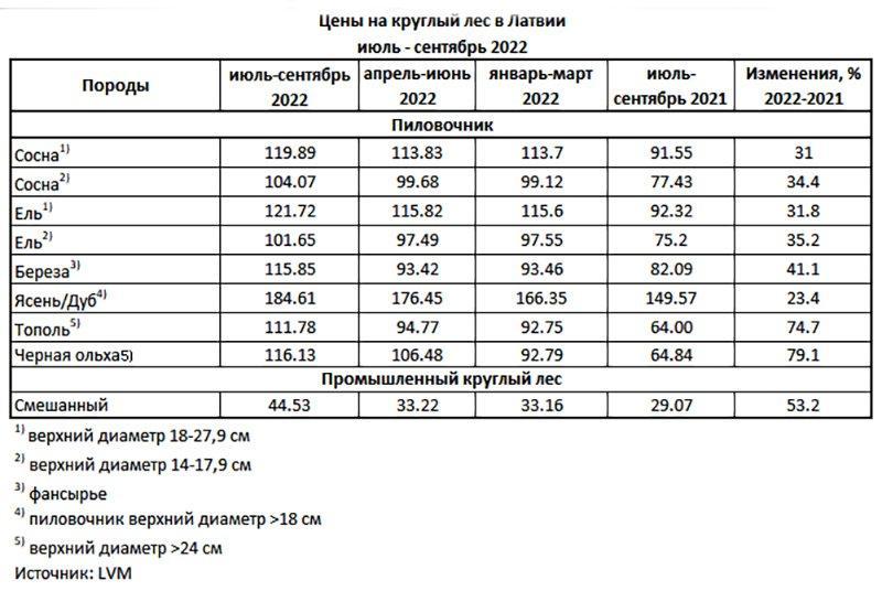 Цены на круглый лес в Латвии в третьем квартале 2022 года были значительно выше, чем во втором. В период с апреля по июнь цены оставались относительно стабильными на уровне предыдущего квартала. Согласно ежеквартальной статистике, опубликованной Латвийской государственной лесной администрацией Риги LVM, рост цен на все сорта круглого леса, пригодного для распиловки и шпона, по сравнению со вторым кварталом был в среднем однозначным. Более выраженный рост отмечен у березы на шпон (+24,0%) и пиловочника из тополя (+17,9%). Цены на сортимент промышленного круглого леса выросли на 34,0%. При 124,81 евро/м³ (80,81 евро/м³) и 94,22 евро/м³ (61,45 евро/м³) соответственно цены на дубовые и березовые дрова были примерно на 54% выше.