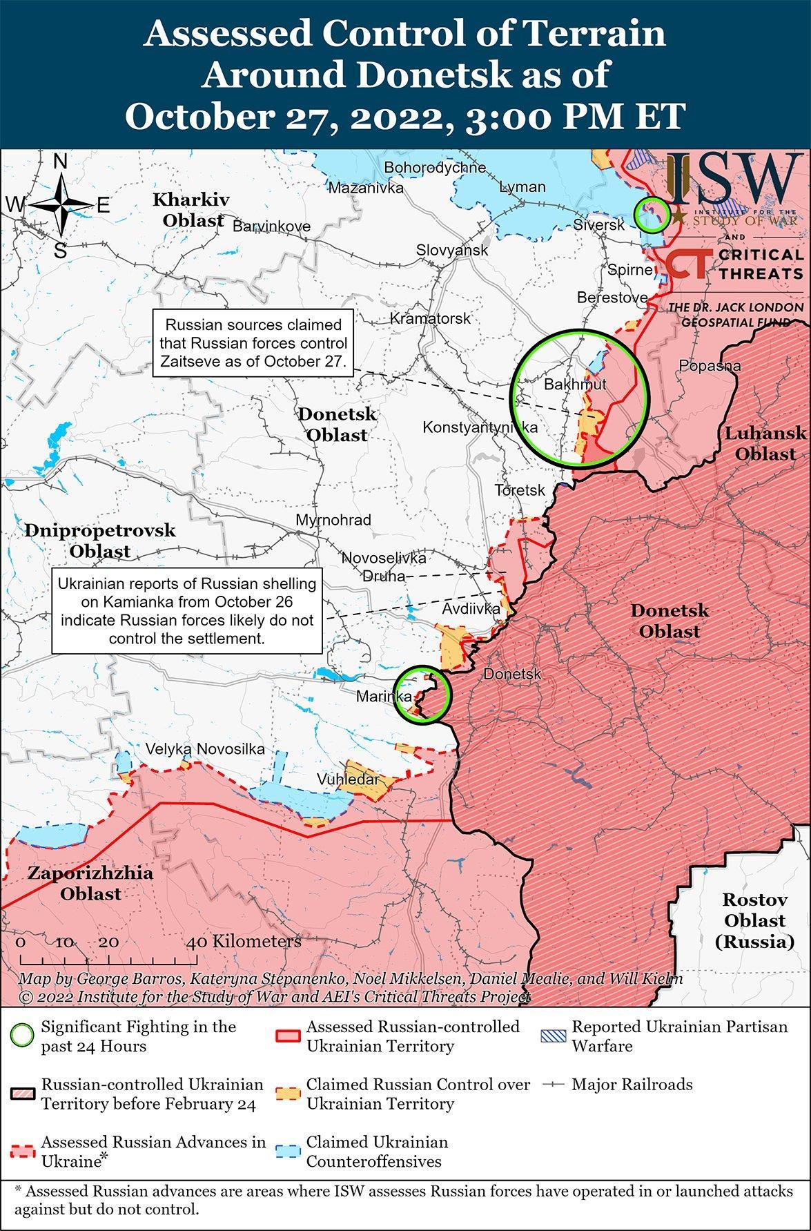 27 октября российские силы продолжали наносить наземные удары в Донецкой области. Генштаб Украины сообщил, что украинские силы отразили атаки российских войск на Бахмут, к северо-востоку от Бахмута в районе Соледар (13 км к северо-востоку от Бахмута) и к югу от Бахмута в районе Иванграда (4 км к югу от Бахмут) и Майорска. Российский блогер заявил, что российские войска также провели наступление к северо-востоку от Бахмута в районе Бахмутского (11 км к северо-востоку от Бахмута). Российские источники сообщили, что российские силы в настоящее время контролируют Зайцево (8 км к юго-востоку от Бахмута), хотя ISW не может независимо подтвердить, что населенный пункт контролируется Россией. Украинский Генштаб сообщил, что украинские силы отразили атаки российских сухопутных войск к юго-западу от Авдеевки в районе Красногоровки (23 км к юго-западу от Авдеевки) и Марьинки (28 км к юго-западу от Авдеевки). Российский милблогер утверждал, что российские войска также провели атаку возле Новомихайловки (37 км к юго-западу от Авдеевки). Украинский Генштаб сообщил, что российские силы продолжали вести обычную стрельбу с закрытых позиций вдоль линии соприкосновения в Донецкой области. Источники в социальных сетях сообщили, что украинские силы нанесли удары по бензовозам на железнодорожной станции в Шахтерске Донецкой области ракетами РСЗО HIMARS.