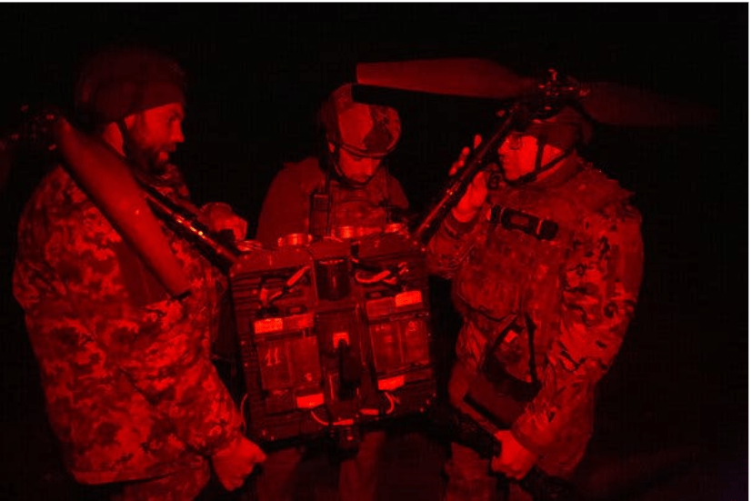 Группа украинских военных вооружила беспилотник бомбами в пятницу во время операции по уничтожению российского бронетранспортера на линии фронта в южной Херсонской области страны. Предоставлено… Финбарр О’Рейли для The New York Times