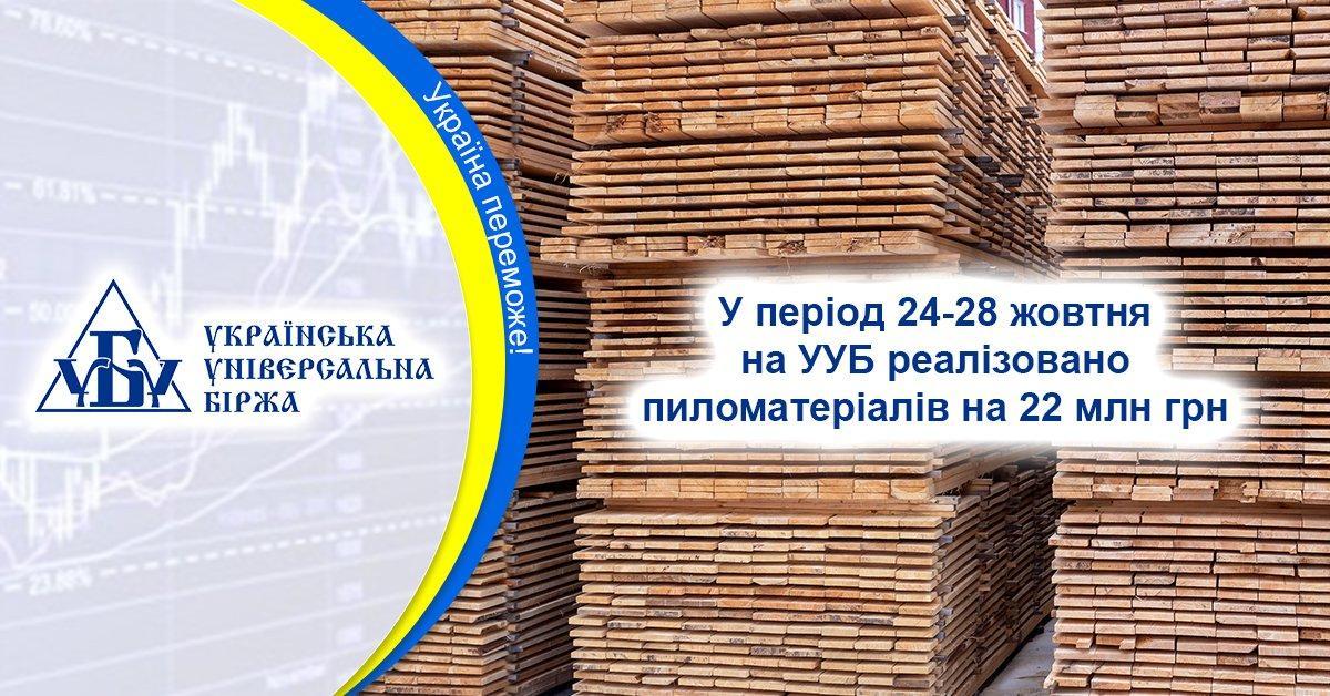 Українська універсальна біржа продовжує успішні торги за напрямком «Необроблена деревина та пиломатеріали». З 24 по 28 жовтня на УУБ було реалізовано 5,639 тис. куб. м пиломатеріалів на 22,161 млн грн. Проведено 24 торги, 38 зі 100 учасників стали переможцями.