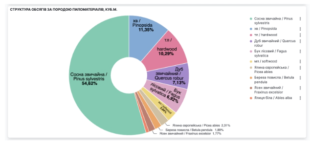 За структурою порід попит мали пиломатеріали з сосни звичайної, інших хвойних, твердолистяних порід та дубу у співвідношенні 54,62%, 11,35%, 10,29% та 7,13% відповідно.