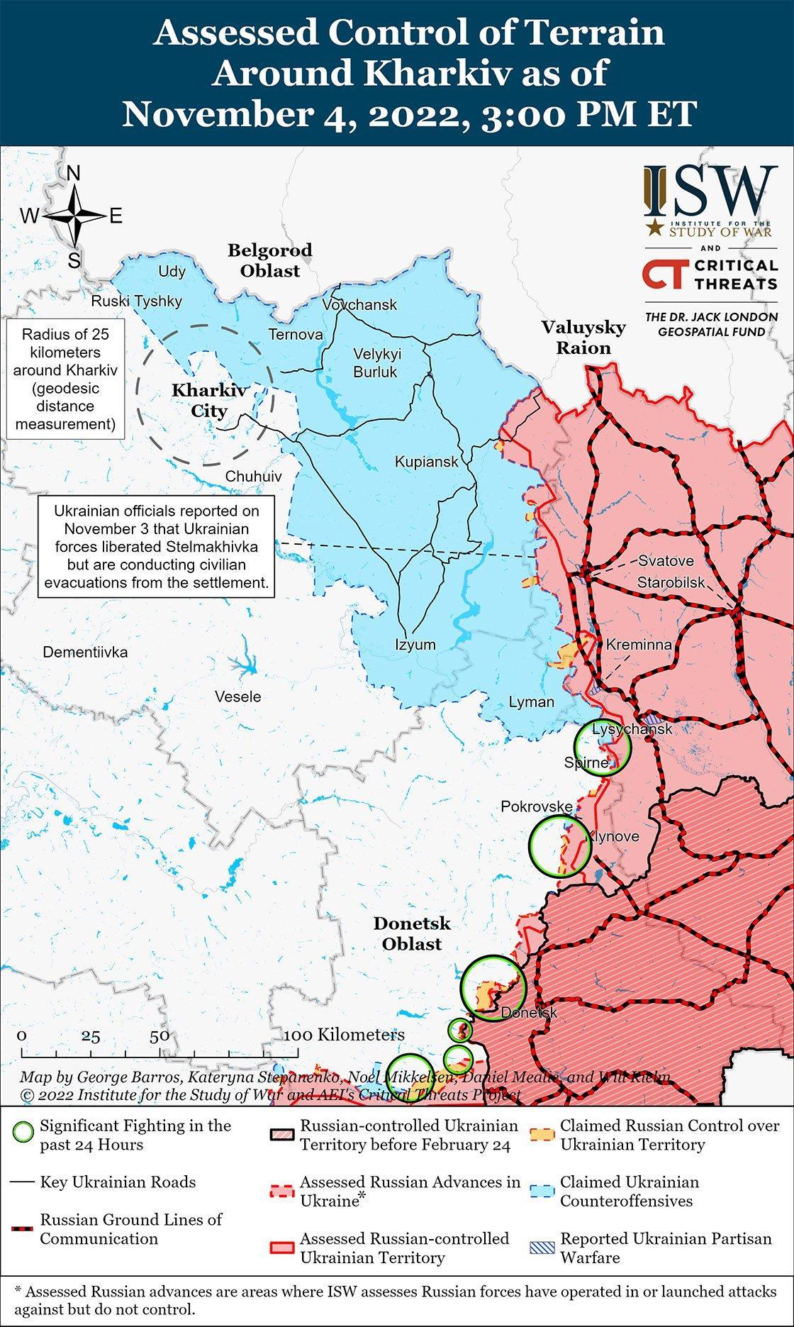Российские источники утверждали, что украинские силы 4 ноября продолжили контрнаступление в направлении Сватово и Кременная. Министерство обороны России сообщило, что российская артиллерия и авиация отразили действия украинских сил, которые пытались атаковать к северо-западу от Сватово в направлении Берестово Харьковской области (21 км к северо-западу от Сватово) и Куземовки Луганской области (14 км к северо-западу от Сватово). Российские милблогеры сообщили, что российские войска отразили украинское наступление в направлении яхидне Харьковской области (28 км к северо-западу от Сватово). [29] Один из милблоггеров сообщил, что украинским войскам удалось войти в Ягодное, но позже российские войска вытеснили их из населенного пункта. Минобороны России также утверждало, что российские войска отразили украинские атаки к северо-западу от Кременной в направлении Плоская (17 км к северо-западу от Кременной) и Червонопоповка (6 км к северо-западу от Кременной). Российский милблогер сообщил, что украинские разведывательно-диверсионные группы прощупывают российские оборонительные рубежи к северо-востоку от Терны (17 км к западу от Кременной). ISW не может самостоятельно проверить российские заявления об украинских контрнаступлениях в направлении Кременной и Сватово 4 ноября.