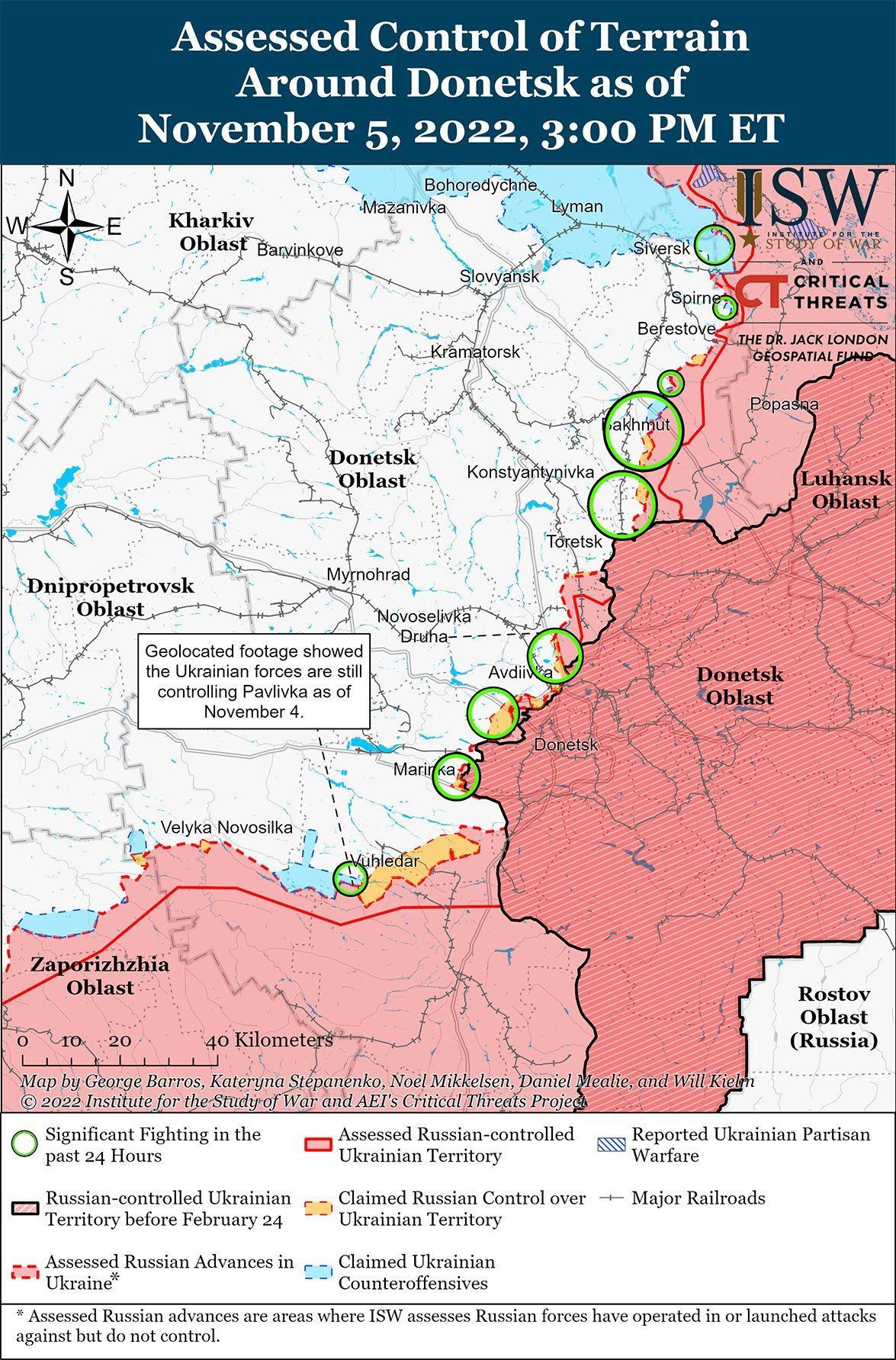 Российские войска продолжили наступательные операции вокруг Бахмута 5 ноября. Украинский Генеральный штаб сообщил, что украинские силы отразили штурмы возле Бахмута; в радиусе 30 км к северо-востоку от Бахмута вблизи Спирне и Бахмутского; и в радиусе 20 км к югу от Бахмута вблизи Иванграда, Клищевки, Озаряновки и Майорска. Глава Донецкой Народной Республики (ДНР) Денис Пушилин заявил 4 ноября, что российские войска продвинулись вблизи Майорска, и выразил надежду, что российские войска вскоре захватят населенный пункт. Российский милблогер утверждал, что российские войска также провели штурм северо-востока Бахмута вблизи Верхнекамянского. 5 ноября другой российский милблогер заявил, что украинские войска должны постоянно ротировать подразделения южнее Бахмута в направлении Иванграда и Веселой Дольни, чтобы противостоять подразделениям ЧВК Вагнера, ведущим наступление в направлении Опытного. 5 ноября отдельный российский милблогер заявил, что российские войска совершили нападение на Опытное с целью перекрыть участок трассы Е50. Другой российский милблогер утверждал, что российские войска отражали украинские контратаки к югу от Бахмута вблизи Опытного и Курдюмовки. Милблогер также утверждал, что украинские войска продолжают сдерживать действия российских войск к югу от Бахмута в районе Иванграда, Одрадевки, Веселой Долины и Зайцево, а также готовятся к городским боям в самом Бахмуте.