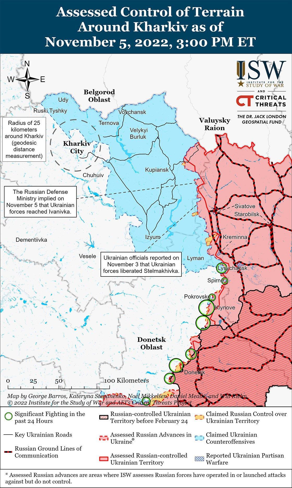 Российские источники утверждали, что украинские войска 5 ноября продолжили контрнаступление вдоль линии Сватово-Кременная. Российские источники, в том числе Министерство обороны России, сообщили, что украинские войска провели штурм в направлении Куземовки, в 13 км к северо-западу от Сватово. Российский блогер утверждал, что украинские войска переправились через реку Жеребец к западу от Сватово и прощупывают российские позиции вдоль линии Куземовка-Коломычиха. На геолоцированных кадрах видно, как украинские войска наносят удары по российской бронетехнике примерно в 30 км к северо-западу от Сватово, что указывает на то, что российские войска сохраняют позиции в районе Ягодное-Орлянки. Российский милблогер утверждал, что украинские силы перегруппировываются в этом районе после неудачного штурма Ягодное. Российский милблогер сообщил, что украинские войска продолжают попытки наступления на Кременную. Украинский Генеральный штаб сообщил, что украинские войска отразили нападение России на Белогоровку, в 10 км к югу от Кременной. Российские источники также утверждали, что украинские силы нанесли удар HIMARS по российским позициям в Сватово и Кременной и обстреляли российские позиции вдоль линии Сватово-Кременная.
