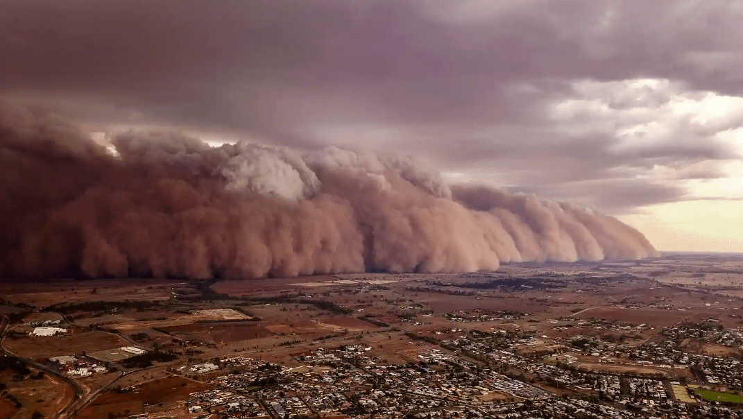 На этом снимке, сделанном беспилотником, показана чудовищная пыльная буря, охватившая центральную часть Нового Южного Уэльса в Австралии в январе 2020 года . Один местный житель сравнил наблюдавшуюся картину со сценой из апокалиптического фильма. Более сухие условия, вызванные изменением климата, связаны с увеличением частоты и силы песчаных и пыльных бурь по всему миру. Помимо воздействия на сельское хозяйство, промышленность и сам климат, переносимая по воздуху пыль может вызывать серьезные проблемы со здоровьем.