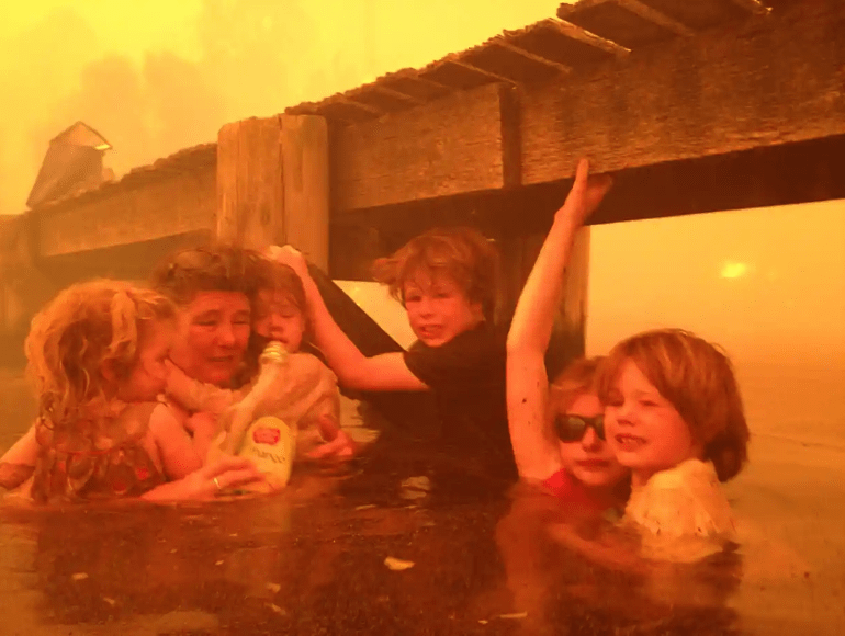 Эта фотография , ставшая символом пожаров, охвативших Австралию в 2013 году, показывает женщину и пятерых ее внуков, укрывающихся в воде под причалом. Лесной пожар охватил их дом в маленьком рыбацком городке на Тасмании. Изображение было снято дедушкой детей, Тимом Холмсом, до того, как ему удалось найти лодку, на которой семья смогла эвакуироваться. «Атмосфера была невероятно ядовитой, — сказал Холмс в интервью вскоре после этого. «Мы все были просто головами, в воде до подбородка и просто пытались дышать».