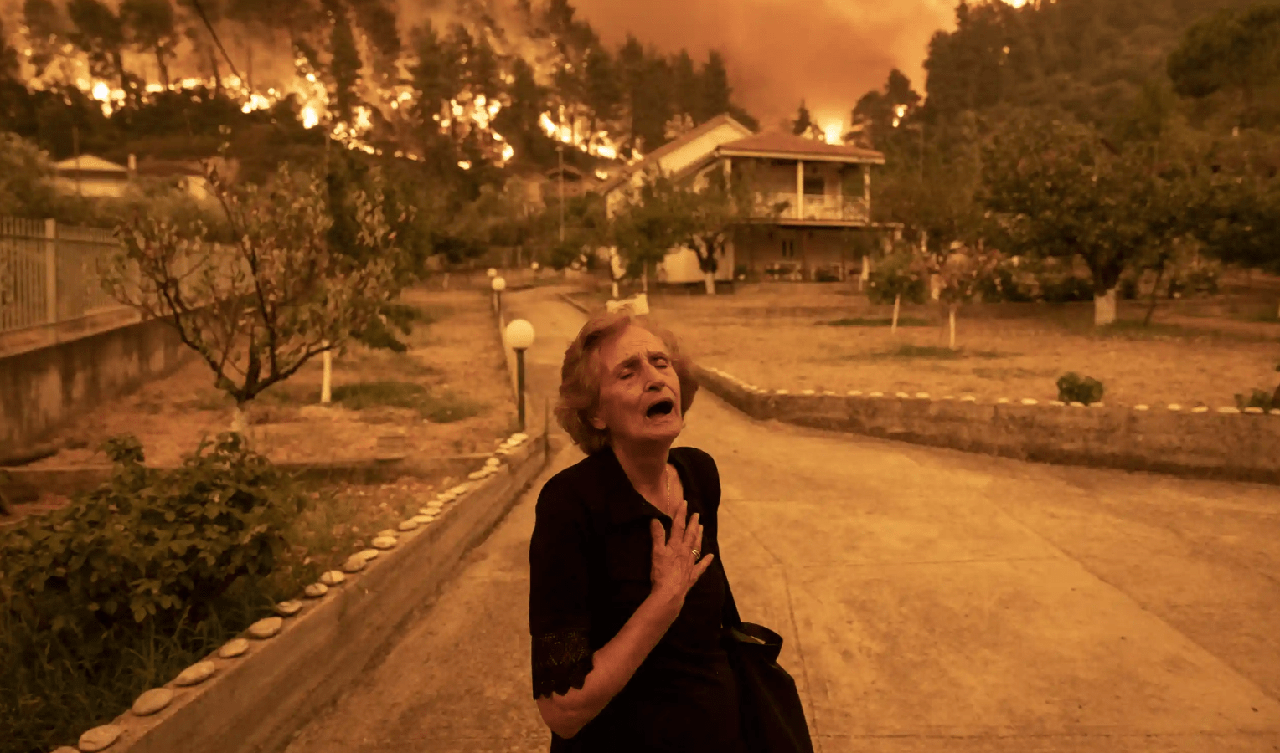 Летом 2021 года в Средиземноморье бушевали лесные пожары. Этот образ пожилой женщины, купающейся в оранжевом свете пламени, стал незабываемым символом разрушения. На нем, снятом 8 августа 2021 года, изображена 81-летняя Панайота Крициопи, убегающая из своего дома на греческом острове Эвия. «В тот момент я кричал не только за себя, но и за всю деревню», — сказала позже Крициопи.