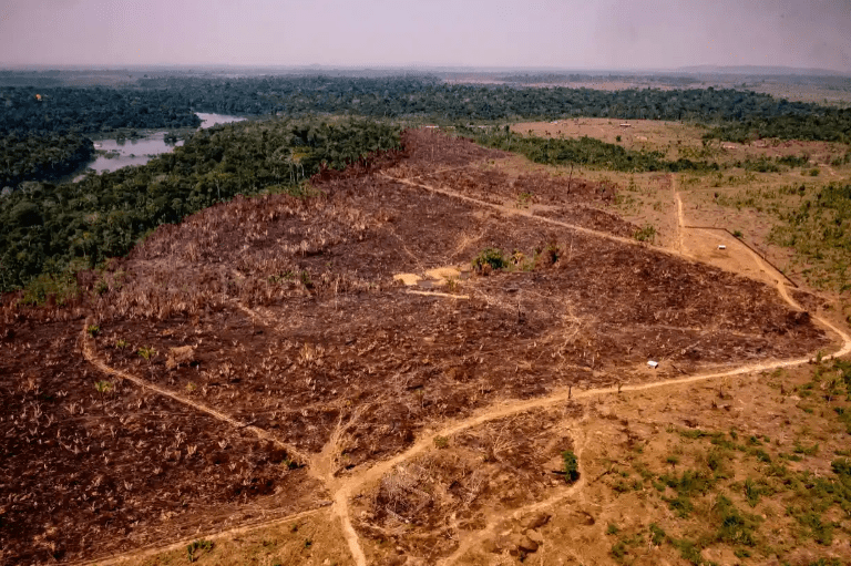Вырубка тропических лесов Амазонки стала символом антропогенного разрушения нашей планеты. Этот вид с воздуха на вырубленный лес в бразильской Амазонии был сделан в 2019 году, в первый год президентства Жаира Болсонару, который почти четыре года наблюдал ошеломляющий рост темпов обезлесения, которое было примерно на 75% выше, чем в предшествующее десятилетие. Пожары часто используются для расчистки земли, в основном для выращивания говядины и сои, что приводит к более засушливым условиям и дальнейшим неконтролируемым пожарам — порочный круг, который означает, что бывший поглотитель углерода теперь производит больше выбросов, чем он способен поглотить.